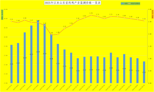 肉雏鸡价格持续回落。本周,我省肉雏鸡均价为2.53元/羽,同比降低18.39%,环比回落1.94%。其中青州市达到本周最高价,为3.60元/羽;最低区域价格在莘县,为0.55元/羽(为817雏鸡价格)。当前行业产能过剩及终端消费偏弱现象仍然存在,肉鸡受下游屠宰端高库存影响,价格上涨乏力,养殖端补栏情绪偏弱,肉雏鸡价格进入季节性走弱阶段,种鸡场维持高报低走态势。长期需关注餐饮消费回暖带动及海外禽流感造成引种断档对行业供需调整作用。当前海外禽流感疫情持续蔓延,法国引种虽放开,美国、新西兰引种仍中断,白羽肉鸡上游产能或进一步收缩,关注引种受限持续性。如近期巴西农业和畜牧业部声明出现首例发生在商业农场的H5N1禽流感疫情,祖代鸡引种仍面临不确定性,利好白羽鸡产业链价格。