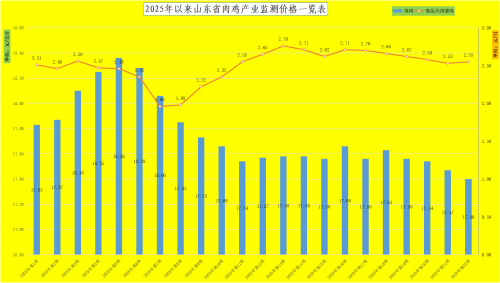 肉雏鸡价格有所反弹,小幅回升。本周,我省肉雏鸡均价为2.55元/羽,同比降低16.94%,环比回升0.79%。其中青州市达到本周最高价,为3.60元/羽;最低区域价格在莘县,为0.60元/羽(为817雏鸡价格)。