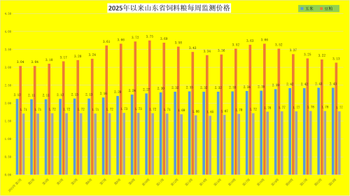 第23周,饲料粮价格震荡,玉米价格企稳,豆粕和小麦麸价格继续回落。本周,我省玉米均价为2.43元/公斤,同比升高2.97%,环比持平;豆粕价格继续回落,为3.13元/公斤,同比降低12.57%,环比降低2.80%;小麦麸价格企稳后弱势回落,为1.77元/公斤,同比升高8.59%,环比降低0.56%。